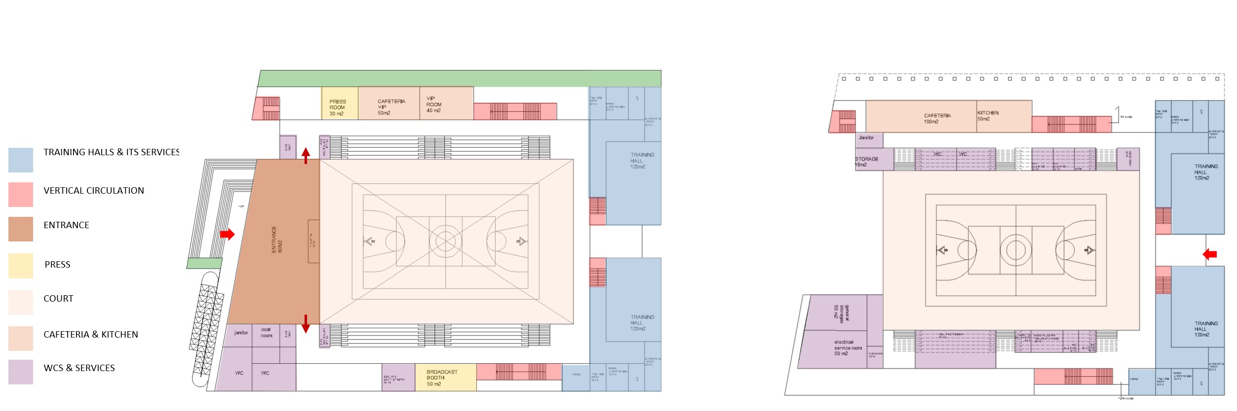 This Sports Center is part of a large university complex in Iraq, it is designed as a bold, grounded volume with strong horizontal lines and warm brick tones, recalling the mass and permanence of Sumerian civic structures. Its layered façades and recessed openings reinterpret ancient brick architecture in a contemporary athletic setting. Deep overhangs, shaded entrances, and screened façades respond to the site’s hot climate by minimizing heat gain and providing comfortable transitional spaces.